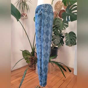 Ragged high-waisted mom jeans, wide leg, bicolor blue diamond-check print, retro streetwear style. Size 28 (S): waist 14", rise 12", inseam 29". Original and trendy, perfect for a bold vintage casual look.
