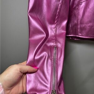 Eye-catching pink leather jacket with a metallic finish. Features classic biker style with zip details. These boots cutest bomber jacket
