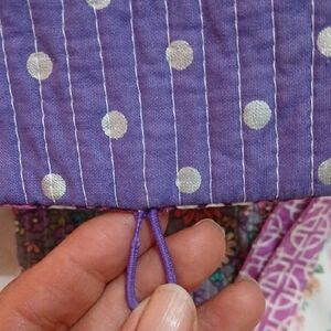 Cute kids or adult crossbody bag, fits a cell phone with a little room left. Small back zipper pocket. Cute fabric and big oversized clear round bead. The purple elastic that closes purse is a little worn, but still has a lot of use left, could be repaired later too if needed. Adjustable strap.