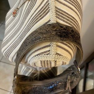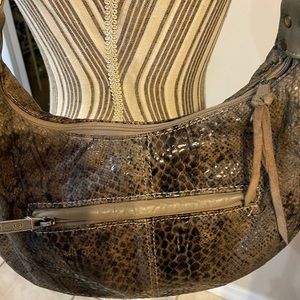 Leather shoulder bag made by Pinky. No tears no fading no smells Leather animal print with 2 very deep zipper outside pockets.on 1 side & Med size zipper compartment on the other side.Inside also has a zipper pocket.,Pinky on both pull zipper. Different shades of brown with silver hardware The 1st picture is a similar bag, just for display only