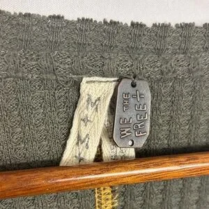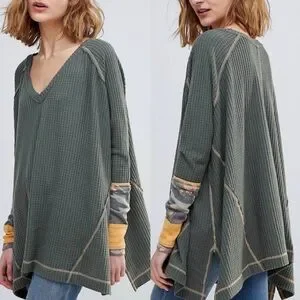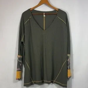 We The Free Green V-Neck Waffle Knit Top with Patterned Sleeves