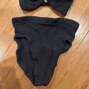 Crinkly black swim suit with high waisted bottoms and bikini style top with a crystal covered heart embellishment