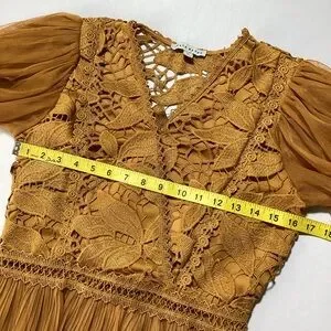 Chic lace blouse with puff sleeves. Features intricate lace design. Faux wrap Perfect for stylish outings.