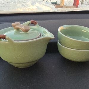 Beautiful green tea set with two cups and a teapot. Comes with a protective case.