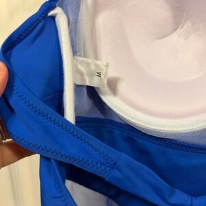 Blue One Piece Swimsuit Mesh Sides Halter Neck Plunging Neckline Women Size M