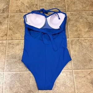 Beautiful royal blue one-piece swimsuit with flattering ruching across the bust and elegant mesh side cutouts. Designed with a halter neckline and a tie closure at the back for adjustable fit. Built-in bra cups offer support and shaping. Perfect for a beach vacation, poolside lounging, or a summer cruise. Preowned, great condition.