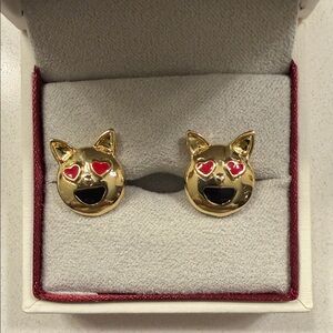Gold Cat Face Earrings with Red Heart Eyes
