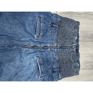The Pilcro Anthropologie The Skipper Strapless Jumpsuit in denim with a wide leg is a stylish and comfortable one-piece outfit perfect for casual occasions. Featuring a square neckline and button closure, this jumpsuit is designed for a plus size 18W fit. Made from 100% cotton denim, this sleeveless jumpsuit has a bohemian theme and is machine washable for easy care. The solid blue color and puff sleeve accents add a touch of happy and Barbie-inspired style to your wardrobe. Perfect for summer, fall, and spring, this wide-leg jumpsuit is a versatile and chic addition to any closet.