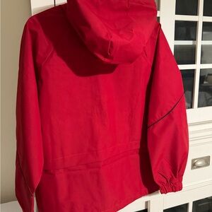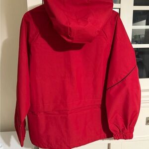 Stylish red hooded jacket. Features a front zipper and pockets.