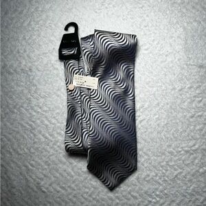 Stylish tie with black and white swirl pattern. Perfect for formal occasions. Style cues and tagging indicate this tie is a kate 80’s-90’s tie. New, never worn, tag intact.