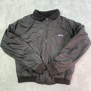 Authentic vintage Patagonia black bomber jacket featuring a zip-front closure, ribbed cuffs and hem, and soft fleece collar. Lightweight and durable nylon shell makes it ideal for transitional weather or everyday wear. Popular with Gen Z for the sporty, blokecore, and gorpcore trends pairs perfectly with Adidas Sambas, cargos, or denim.
