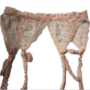 Elegant lace garter belt in a soft peachy pink color. Vintage union made. Size M