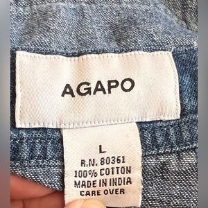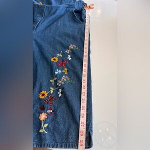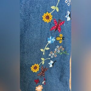 The product is a pair of vintage Agapo overalls in a women's Large crop length, featuring blue denim with embroidered floral and cute insect accents. These overalls feature a square neckline and embroidered sunflowers, butterflies , bees, ladybugs, and other floral accents.These one-piece overalls have a button closure, adjustable straps, and a straight leg style. Features back pockets, front center chest pocket and hip pockets. Also has 5 belt loops. They are suitable for various occasions such as casual, workwear, and parties, and are made of a denim fabric with a stretch and breathable features. The overalls have a retro vibe with a mix of hippie, bohemian, and American themes, making them a unique addition to any wardrobe.