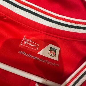 Vibrant red sports jersey by MACARON. Features a distinctive logo and stylish collar design.