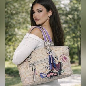 Chic Coach tote with playful graphics. Beige body with purple accents. Ideal for daily style. In excellent condition. 2010