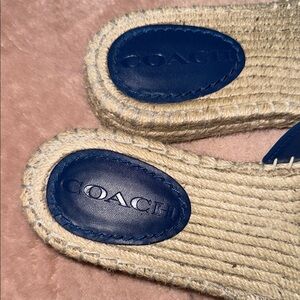 Elegant navy espadrille slides by Coach. Features a stylish silver emblem. Ideal for casual elegance.