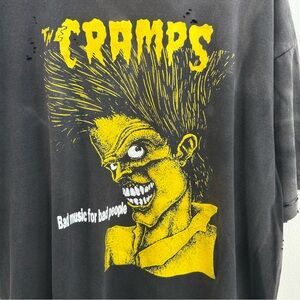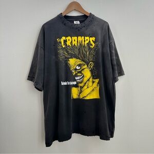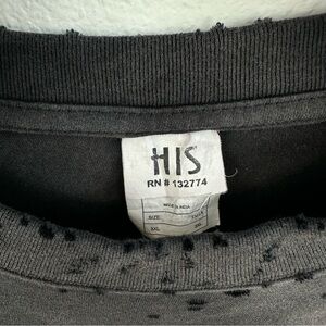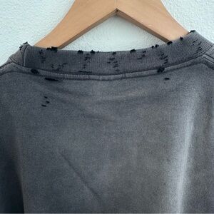 soft hand feel knit fabric with nicely worn down washed look. holes, rips, pulls with nice fade and stains from wear and age.....looks cool!