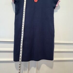 Free Assembly women's polo dress in size XXL, new with tags. Features navy blue body with pink collar trim and sleeve cuffs, coral pink split V-neck placket, short sleeves, and knee-length silhouette. Made of 50% Lenzing Ecovero viscose, 28% polyester, and 22% nylon for comfortable wear. Retro preppy colorblock style perfect for casual summer wear or sporty chic looks. New with tags, excellent condition.