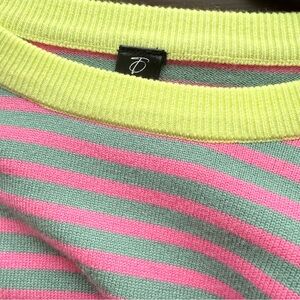 So super soft and comfy with stretch. Vibrant pink and gray striped sweater with yellow neckline, waist, and sleeve detail. Perfect for a fun look. Excellent gently preloved condition with no flaws.