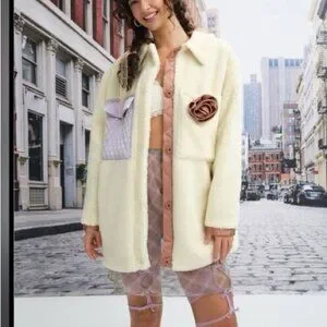 Elegant ivory teddy jacket. Features a unique rose detail and quilted pocket. Perfect for stylish layering. Lined. Snap front closure.