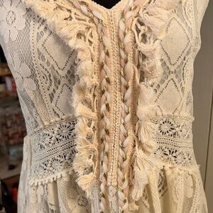 Elegant cream lace boho hi low maxi dress. Features V-neck, adjustable straps, decorative braided tassels with poms on the end in the front, and partially lined. Perfect for special occasions.