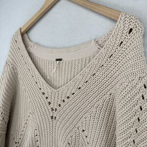 FREE PEOPLE Sweater M All Day Long V-Neck Chunky Textured Cotton Blend Beige