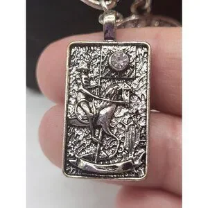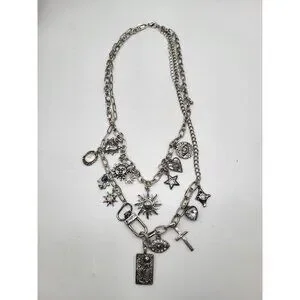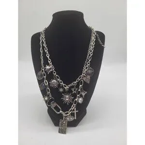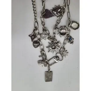 Silver Tone Charm Necklace Tarot Sun Evil Eye Hamsa Hand Cross Hearts Stars Goth