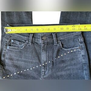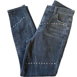 Dark wash skinny jeans from 7 For All Mankind adorned with scattered silver-toned stud detailing along the front legs and pockets. These jeans offer a flattering skinny fit and a classic dark denim look enhanced by subtle metallic accents. Perfect for a night out or adding an edgy touch to a casual ensemble.