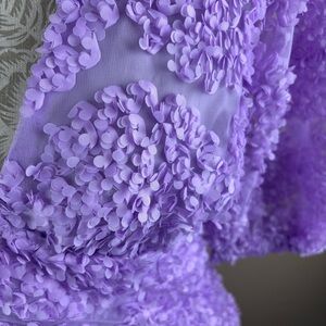 Absolutely gorgeous unique dress with textured floral design over a sheer body. Lined. Blouse part wraps and ties in the back.