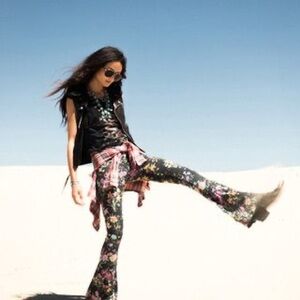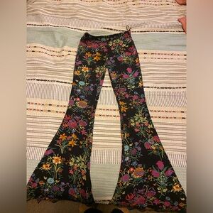 Chic black flare pants with colorful floral patterns. Ideal for a bold fashion statement.