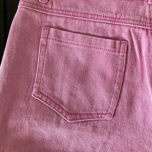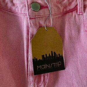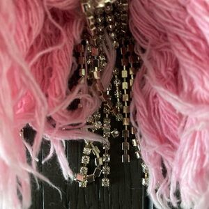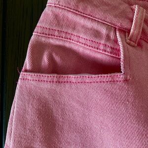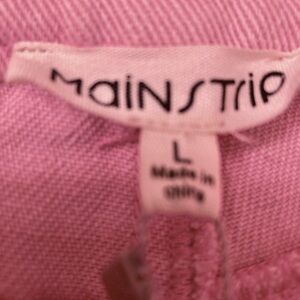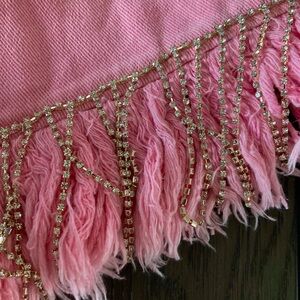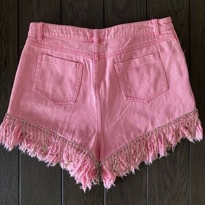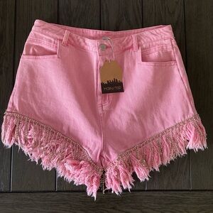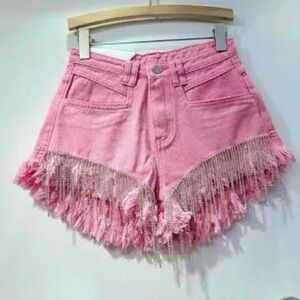 These are NWT MAINSTRIP Rhinestone Fringe Shorts. Cute pink 5 pocket denim shorts with a button and zip front closure. Dazzling rhinestones with fringe would look adorable with a pair of cowboy boots. Very light snag barely visible in front. See last pic. Size: L. Beach, Barbecue, Sprig/Summer. Adorable.