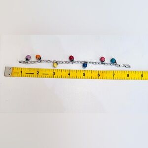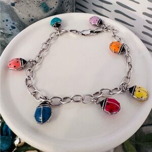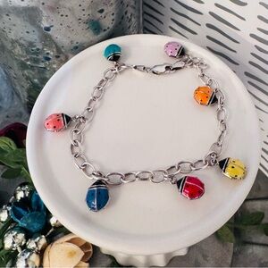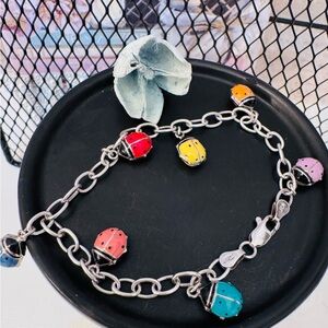 Jacmel “JCM” Mauritius Sterling silver ladybug charm bracelet. Charming bracelet with colorful ladybug charms. Features pink, orange, yellow, and blue accents.