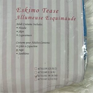 Brand new! Blue Eskimo costume with white fur trim. Includes hooded top, mini skirt, and leg warmers.