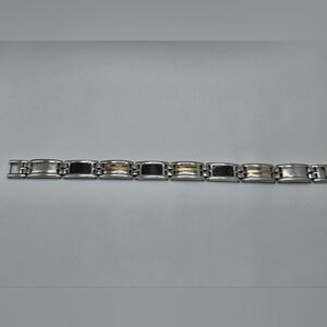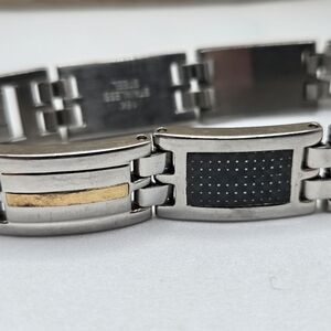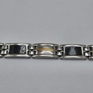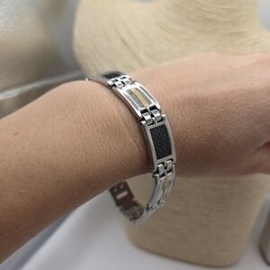 Men Stainless Steel Black Carbon 18K GP Three Tone Link Bracelet Signed Alpine