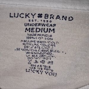 Lucky Brand Med White 100% Cotton Crewneck Tee Clover Logo Short Sleeve Classic. Lucky Brand classic crewneck tee in soft 100% Cotton with small navy clover logo detail near hem.