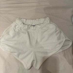 Comfy white shorts with a stylish pink and orange gradient logo. Ideal for lounging.