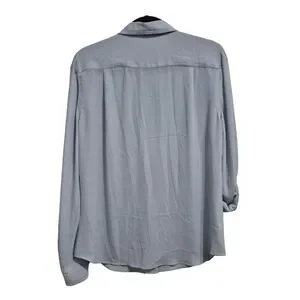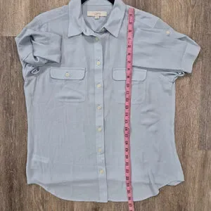 This is a pre-owned LOFT brand button-down shirt, size medium. It features a light blue color, long sleeves with roll-up tabs, and two chest pockets with button closures. The shirt has a full button-down front. The material appears to be a lightweight, possibly synthetic fabric. There are no immediately visible stains, tears, or other significant imperfections. The shirt is in good, wearable condition.