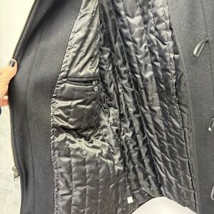 Very nice men's wool coat in the color black with quilted interior in a size large. Coat is in good condition- no tears rips or holes. Seems to catch every piece of lint near it! I've done my best to lint roller it.