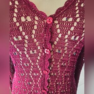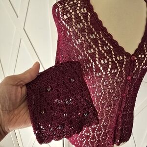Nina Piccalino Burgundy crochet cardigan, adorned with beautiful beading, and flowered button-up front. See through and perfect for layering.