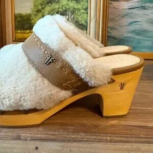 Women's Frye Jessica Leather and Shearling Block Heel Clog in Tan Size 8.5 NEW