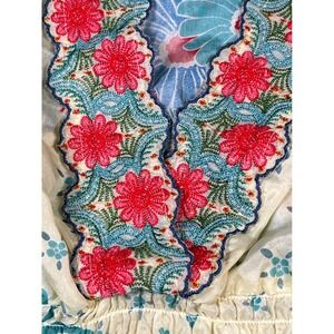 Sundance silk tunic top in a pale yellow floral print. Intricate embroidery adorns the V-neckline with pops of red and blue flowers. Elasticated smocked waistband defines the silhouette. Bell sleeves add a bohemian flair. Perfect for a casual day out, vacation, or resort wear.