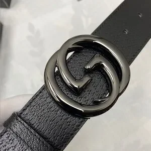 Unisex Gucci Black Leather Interlocking G Gunmetal Buckle Belt