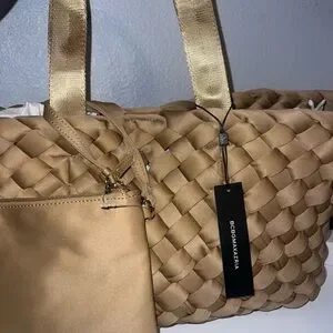 Stylish gold woven tote by BCBGMaxAzria. Includes matching pouch. Ideal for everyday elegance.