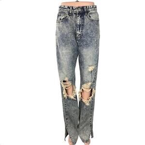 Nasty Gal NWT Blue Acid Wash Distressed Rip High Rise Straight Leg Jeans Cotton Blend Side Slit Hem Relaxed Fit Vintage-Style Colorshade Zip Fly Button Closure Denim Y2K