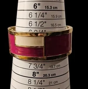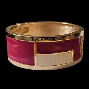 This exquisite Landau bracelet combines vibrant pink, white and gold hues, creating a striking piece of jewelry. The bracelet features geometric elements that enhance its elegance and charm. Perfect for adding a touch of sophistication to any outfit.