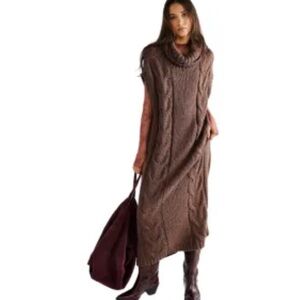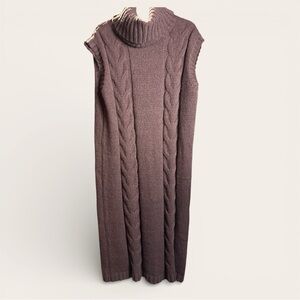 Stay cozy and stylish with this sleeveless cable knit sweater dress. Perfect for layering, this brown dress offers a chic and comfortable fit.
