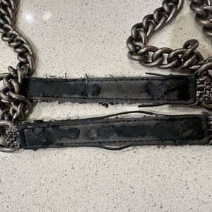 Kurt Geiger London tweed shoulder bag with chain strap and padlock closure. Pre-owned with visible wear to strap fabric and interior. Exterior and structure intact.