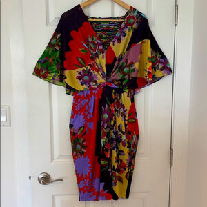 Anthropologie x RANNA GILL dress Sabatina floral Colorful flutter sleeves, v-neck, size medium, with lots of stretch, multicolours, invisible side zipper, unique knotted back detailing, lined skirt Marked as dry clean only, but could be machine washed in delicate, or hand washed Measurements are in the pictures Pictures of models are from the internet and are to show style and fit only Anthropologie x RANNA GILL dress Sabatina floral Colorful flowy sleeves size medium