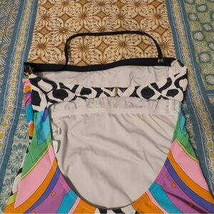 Trina Turk Balboa Bandeau one pc swimsuit, sz 10, WITH black halter top strap. White background with multi-color/geometric pattern. Gently used with no stains, tears, all straps are in place.