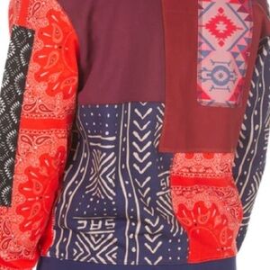 A patchwork of mixed patterns decorate this bomber jacket, styled with a band collar and plenty of pockets.